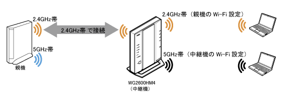 <WPSでデュアルバンド中継機能に対応していない親機とWi-Fi接続した場合>