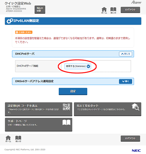 「DHCPv6サーバ機能」で「使用する(Stateless)」を選択します。 設定画面イメージ