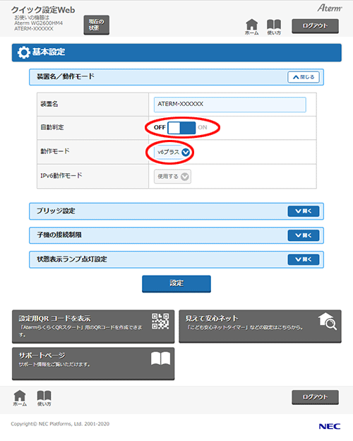 「自動判定」を「OFF」にしてから、「動作モード」で「v6プラス」を選択します。