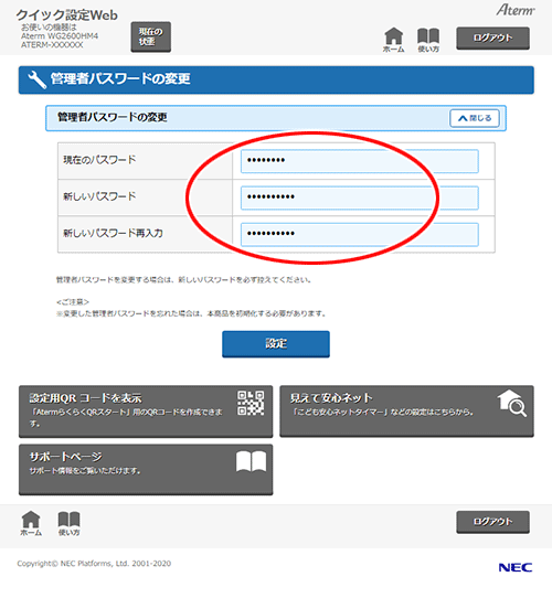 管理者パスワードは、クイック設定Webで本商品の設定をする場合や、不正アクセスを防止するためのパスワードです。