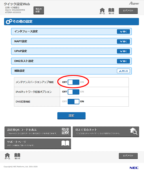 「メンテナンスバージョンアップ機能」 : ON