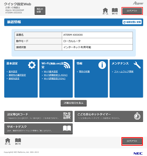画面の説明は、「クイック設定Webの画面について」を参照してください。