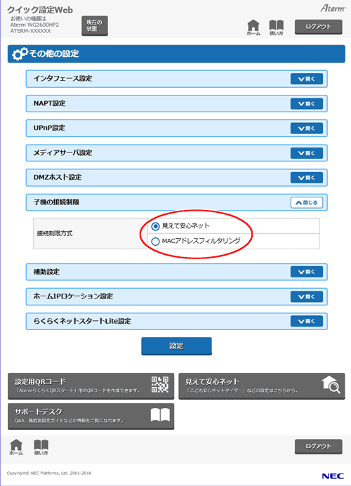 接続を制限する子機の登録方法は、「見えて安心ネット」の端末設定による方法と、クイック設定Webの「MACアドレスフィルタリング」で接続を制限する子機を登録する方法の2つがあります。