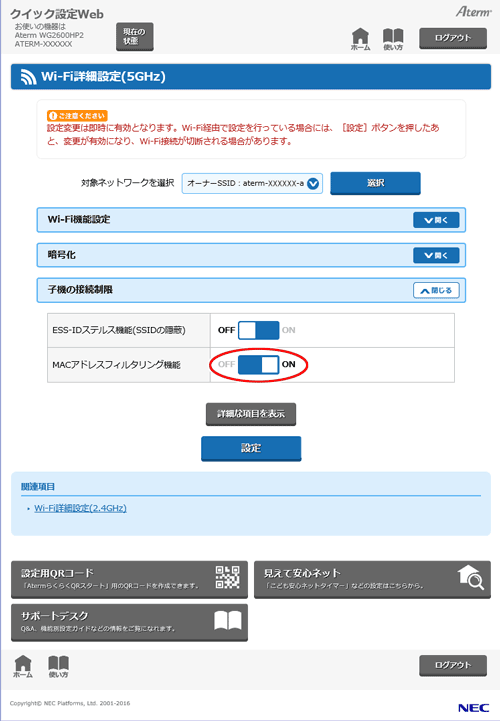 設定方法は、機能別設定ガイドのMACアドレスフィルタリング設定を参照してください。(2019年4月現在)