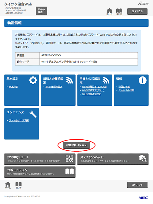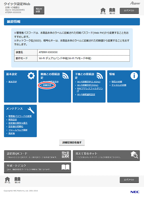 • 通常は、WAN側のDHCPサーバから自動的に割り当てられたネームサーバをご利用ください。(クイック設定Webのホーム画面で[詳細な項目を表示]をクリックし、「親機との接続設定」-「詳細設定」で、「DHCPクライアント機能」を「ON」に設定)