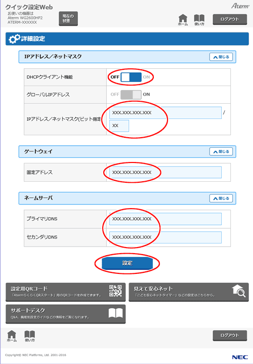 「DHCPクライアント機能」で「OFF」を選択し、下記の項目を入力して、[設定]をクリックします。