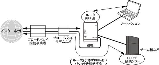 パソコンやゲーム機などでPPPoE(PPP over Ethernet)プロトコルの利用が必要な場合やグローバルIPアドレスが必要なアプリケーションを利用する場合は、PPPoEブリッジ機能を使用して、接続できます。