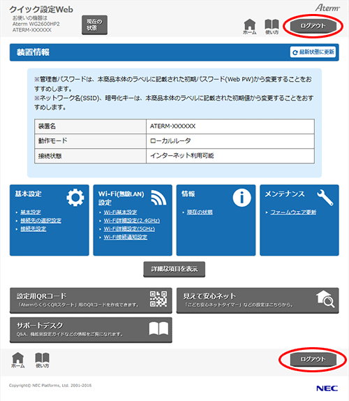 画面の説明は、「クイック設定Webの画面について」を参照してください。