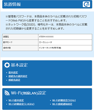 本商品の装置名、現在の動作モード、インターネット接続状態を表示します。