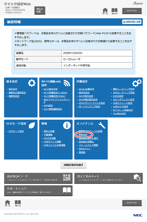 ※ ブリッジモード、中継機モード、Wi-Fi子機(CONVERTER)モードでご使用の場合は、「基本設定」-「基本設定」をクリックします。