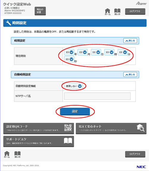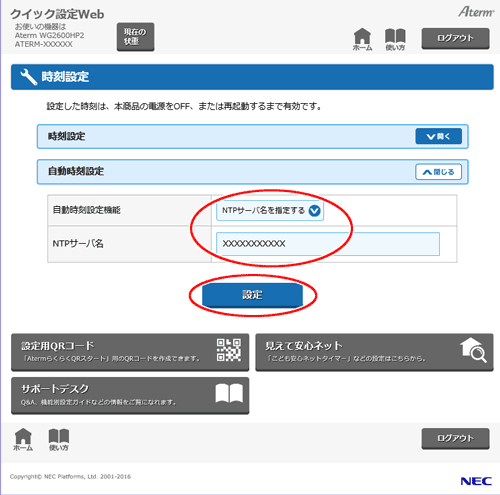 ※「自動時刻設定機能」で「自動設定」を選択した場合は、「NTPサーバ名」の入力は必要ありません。(本商品既定のNTPサーバに時刻の問い合わせを行います。)
