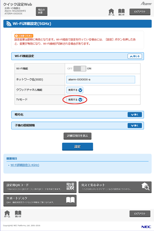 ホーム画面の「子機との接続設定」-「Wi-Fi詳細設定(5GHz)」をクリックします。