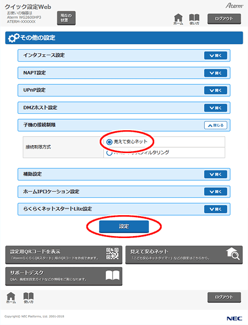 「見えて安心ネット」を指定した場合は、本商品の「見えて安心ネット」で端末区分を「おとなの端末」もしくは「こどもの端末」に設定した子機のMACアドレスが、自動的に「接続を許可するMACアドレスエントリ」に登録されます。