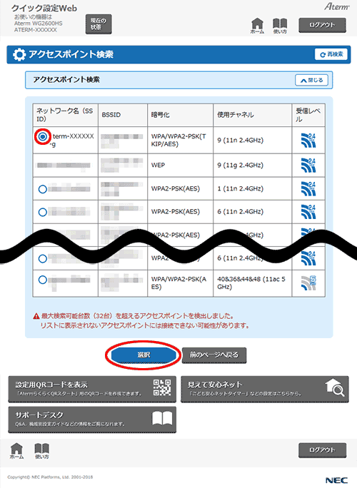 ※ 接続したい親機のネットワーク名(SSID)が表示されない場合は、親機に設定されているWi-Fiのステルス設定を解除してから、再度本設定を行ってください。