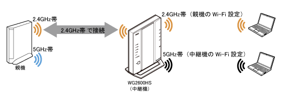 <WPSでデュアルバンド中継機能に対応していない親機とWi-Fi接続した場合>