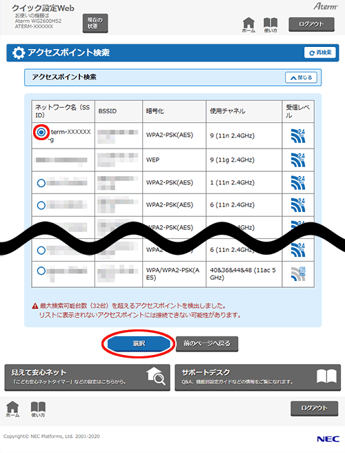 ※ 接続したい親機のネットワーク名(SSID)が表示されない場合は、親機に設定されているWi-Fiのステルス設定を解除してから、再度本設定を行ってください。