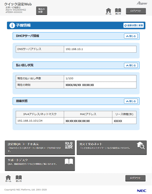 本商品のDHCPサーバ機能が払い出しているIPアドレスと割り当てられている端末を「子機情報」で確認できます。