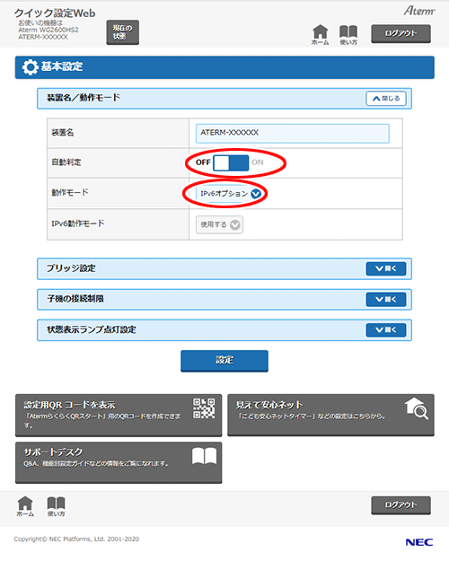 確認・変更方法は、本ページの「クイック設定Webで設定する」を参照してください。