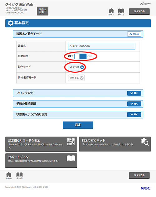 「自動判定」を「OFF」にしてから、「動作モード」で「v6プラス」を選択します。
