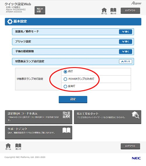 「状態表示ランプ点灯設定」で点灯状態を選択します。