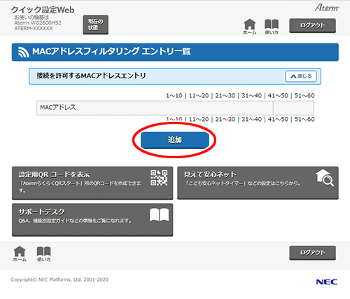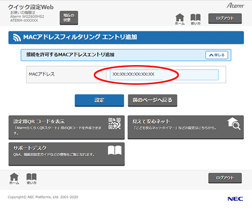 「MACアドレスフィルタリング」を指定した場合は、クイック設定Webの「MACアドレスエントリ」で、接続を制限する子機のMACアドレスを直接入力することにより登録します。
