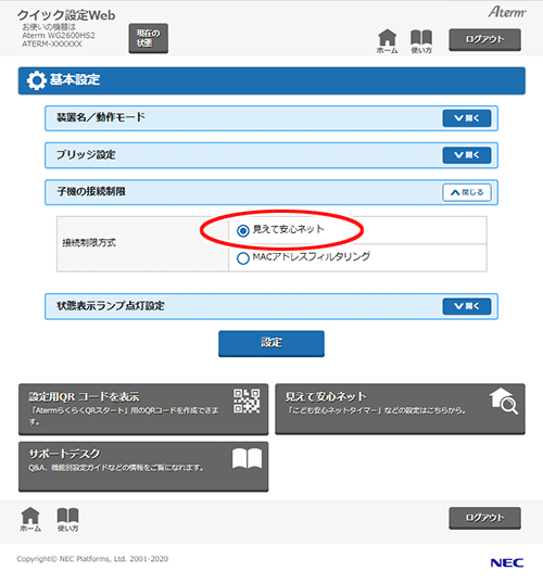 「見えて安心ネット」を指定した場合は、本商品の「見えて安心ネット」で端末区分を「おとなの端末」もしくは「こどもの端末」に設定した子機のMACアドレスが、自動的に「接続を許可するMACアドレスエントリ」に登録されます。