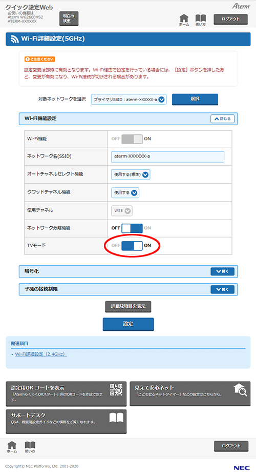 ホーム画面の「Wi-Fi(無線LAN)設定」-「Wi-Fi詳細設定(5GHz)」をクリックします。