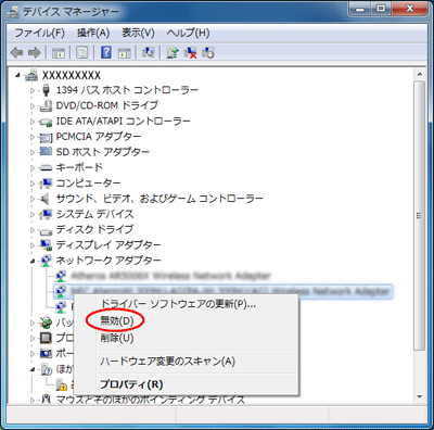 - 不要なネットワークアダプタを選択して右クリックし、[無効]を選択する