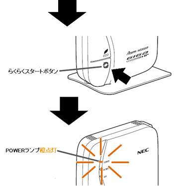 しばらく待って、POWERランプが橙点滅に変わったら、30秒以内にらくらくスタートボタンを長押しし、POWERランプが橙点灯したら放す