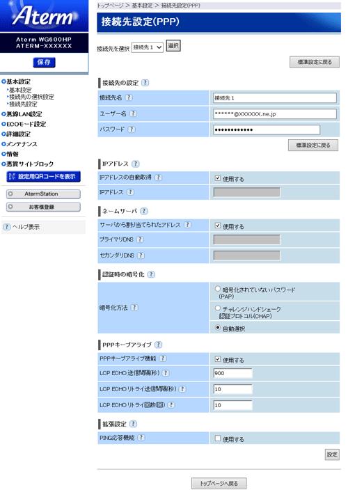 ●PPPoEルータモードの接続先設定