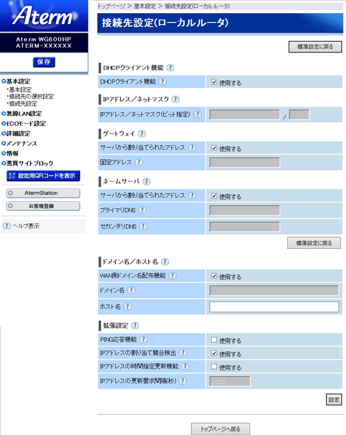 本商品のWAN側でDHCPによるIPアドレス取得を行います。通常、チェックをしたままでご利用ください。 |