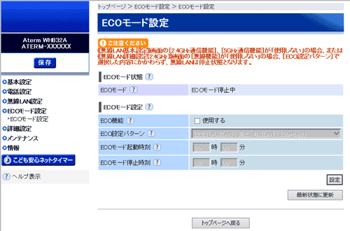 | 本商品のECOモードの設定を行います。 一部の機能を制限することで消費電力を抑えることができます。 設定値を選択・入力したあとは、[設定]をクリックします。 「無線LAN基本設定」の[2.4GHz通信機能]、[5GHz通信機能]が「使用しない」の場合、または「無線LAN詳細設定(2.4GHz)」の[無線機能]が「使用しない」の場合、[ECO設定パターン]で選択した内容にかかわらず、無線LANは停止状態となります。 |