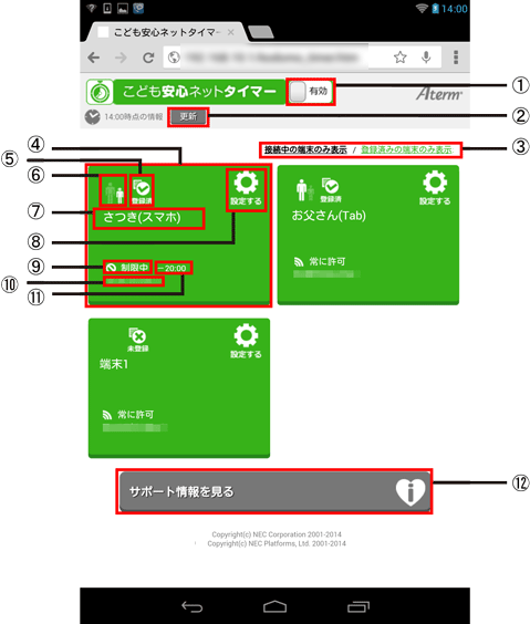 | 本商品の「こども安心ネットタイマー」の画面について説明します。 | ||||||||||||||||||||||||||||||||||||||||||||||||||||||||||||||||||||||||||||
