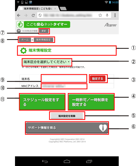 本商品の「こども安心ネットタイマー」の「端末情報設定」画面について説明します。 |