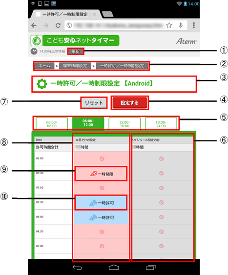 本商品の「こども安心ネットタイマー」の「一時許可/一時制限」画面について説明します。 |