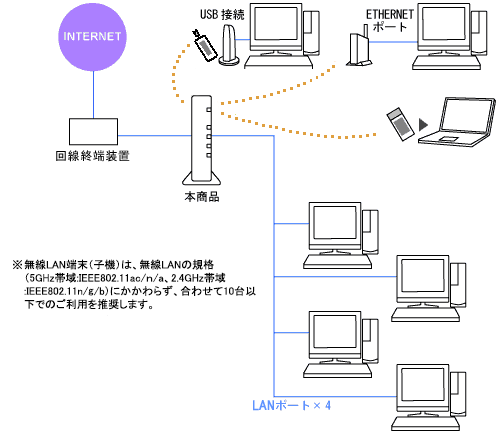 無線LAN端末(子機)は、無線LANの規格(5GHz帯域:IEEE802.11ac/n/a、2.4GHz帯域:IEEE802.11n/g/b)にかかわらず、合わせて10台以下でのご利用を推奨します。 |
