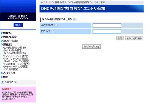 | ■DHCPv4固定割当設定 エントリ追加 |