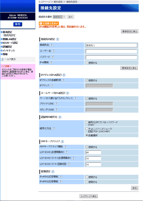 (本項目がグレーアウトしている場合は「らくらくネットスタート」により自動設定済みです。設定の必要はありません) |