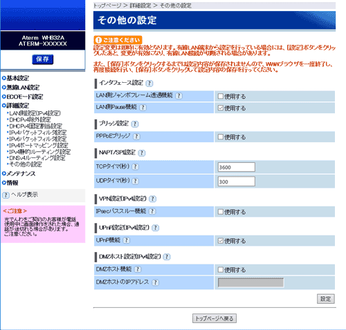 NAPT/SPI機能を使用する際のIPアドレス/ポート番号の動的変換テーブルの有効保持時間(秒)を入力します。NAPTテーブルが枯渇して通信ができなくなるアプリケーションを利用する場合は、本タイマを短めに設定すると解決できることがあります。入力できる値は、30〜3600(秒)です。(IPv4/IPv6共通) |
