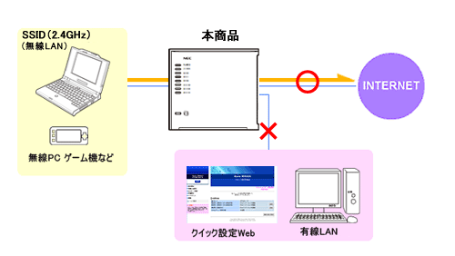 ※ インターネットや同一のSSID側の無線LAN端末(子機)とのみ通信可能です。