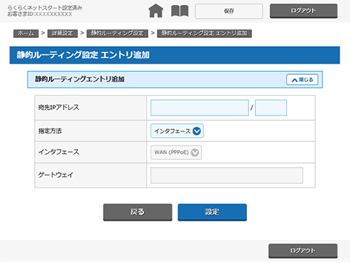 [追加]をクリックすると[静的ルーティング設定 エントリ追加]に進みます。