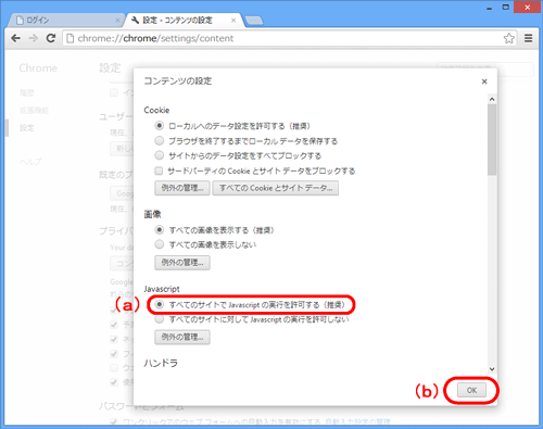 「Javascript」で「すべてのサイトでJavascript の実行を許可する(推奨)」を選択する(<図1>の(a))