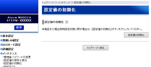 | 本商品の設定内容を初期状態に戻します。 本商品がうまく動作しない場合は、本商品を初期化して初めから設定し直すことをお勧めします。 初期化を行っても、設置後にバージョンアップされた本商品のファームウェアは、出荷時点のファームウェアに戻ることはありません。 |