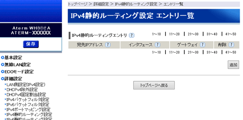 [IPv4静的ルーティング エントリ]に表示されているエントリの中から、削除したいエントリの行末の[削除]をクリックすることで削除できます。 |
