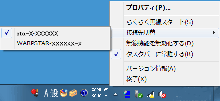 パソコンの画面右下の通知領域(タスクトレイ)にあるサテライトマネージャのアイコンを右クリックすると、ポップアップメニューが表示されます。