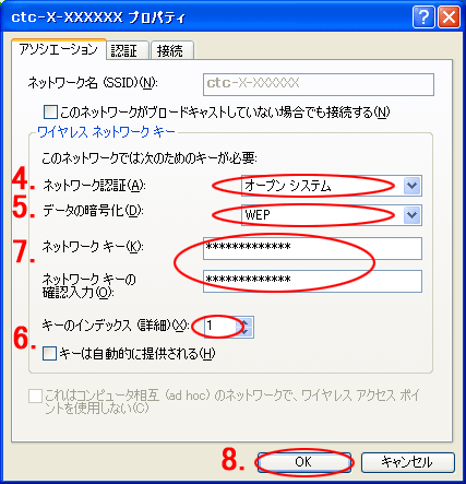 「キーは自動的に提供される」のチェックを外し、接続するネットワークの設定に合わせてキーのインデックス番号を選択します。 |