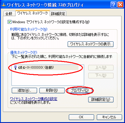 [ワイヤレスネットワーク]タブを選択し、[優先ネットワーク]内から、接続する本商品(親機)のネットワーク名(SSID)を選択し、[プロパティ]をクリックします。 |