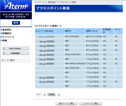 [アクセスポイント検索]をクリックして[アクセスポイント検索]画面を表示してネットワーク名(SSID)を選択することもできます。