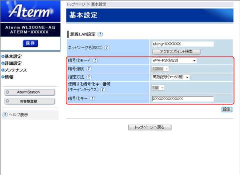 9. 無線LANアクセスポイント(親機)の暗号化設定に合わせて暗号化の設定を行う
