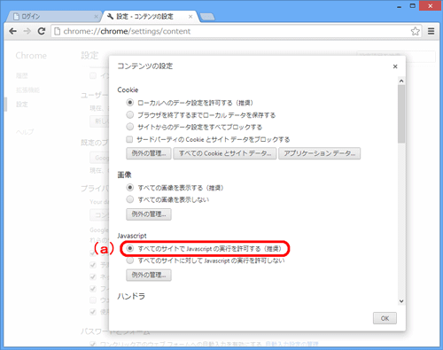 5. 「Javascript」で「すべてのサイトでJavascript の実行を許可する(推奨)」を選択して[OK]をクリックする(<図1>の(a))